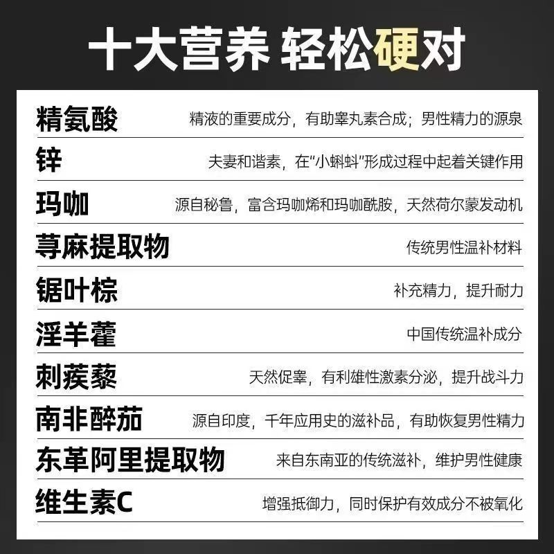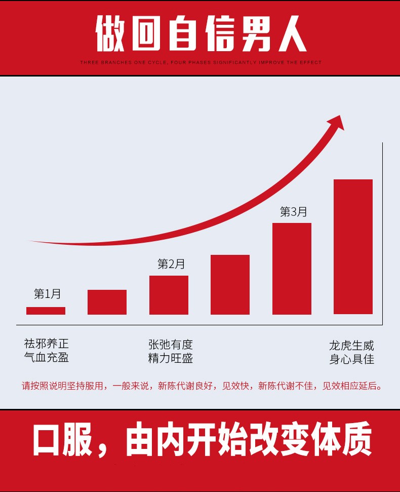 2、鹿血片精选了源自药食同宗的鹿鞭、牡蛎肽、人参、玛咖、黄精、枸杞子等多种名贵天然中药材珍品。经过32道GMP标准的工序,运用现代高效的进口尖端科技对原料的提取,其独特的配方和温补中药材的科学配比,可以增加根部血液的回流和容量,释放人体储存和启动体内的天然男性荷尔蒙,提供增长所必须的营养和活性素,增加扩大海绵体,对增加大、粗、时长等效果和作用明显,使其旺盛精力,激活你的洪荒之力。